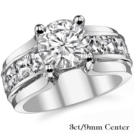 This beautiful Moissanite ring features a round brilliant Moissanite center stone, princess cut Moissanite side stones that run from side to side and underneath the center stone, and is set in a heavy 14k gold, 18k gold or platinum setting.