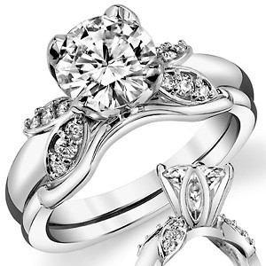 This beautiful Moissanite engagement ring features a floral inspired design with tulip style prongs, 0.20ct of round colorless brilliant Moissanite side stones, and is set in platinum or 14k gold (white gold center stone prongs). It has an optional matching band.