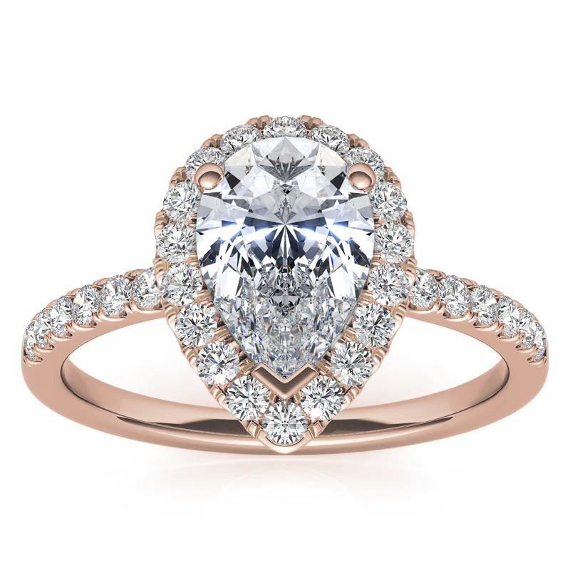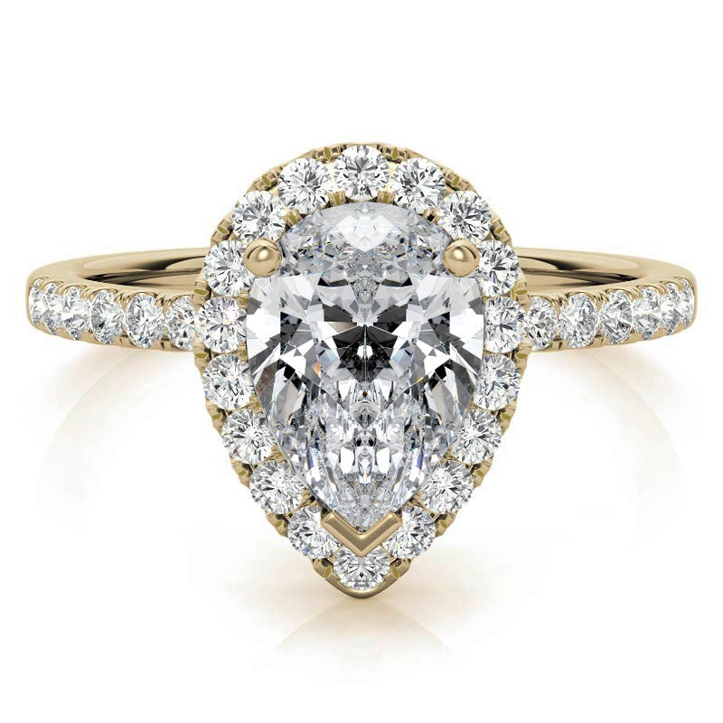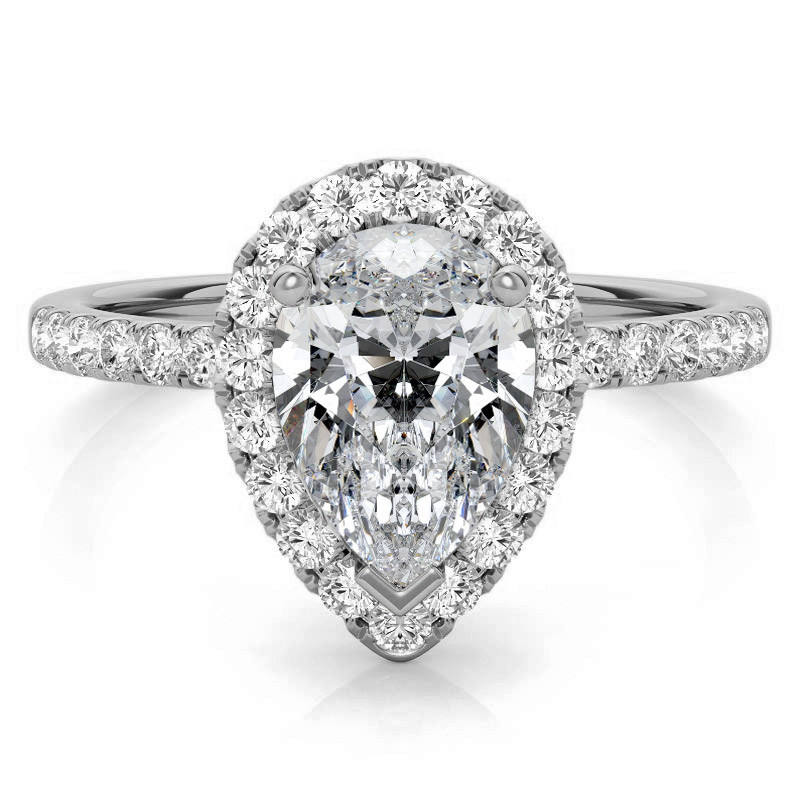Featuring a classic halo design, this ring is crafted with a pear cut Moissanite center stone, and 0.45ct - 0.50ct of round brilliant Moissanite side stones, each measuring 1.5mm. The result is a mesmerizing display of sparkle and brilliance that will take your breath away.