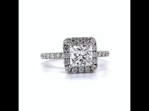 Featuring a classic halo design, this ring is crafted with a princess cut Moissanite center stone, and 0.45ct - 0.50ct of round brilliant Moissanite side stones, each measuring 1.5mm. The result is a mesmerizing display of sparkle and brilliance that will take your breath away.