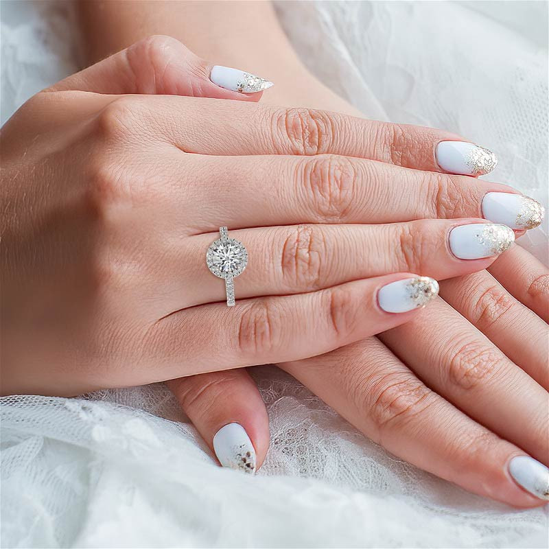 Featuring a classic halo design, this ring is crafted with a round brilliant Moissanite center stone, and 0.45ct - 0.50ct of round brilliant Moissanite side stones, each measuring 1.5mm. The result is a mesmerizing display of sparkle and brilliance that will take your breath away.