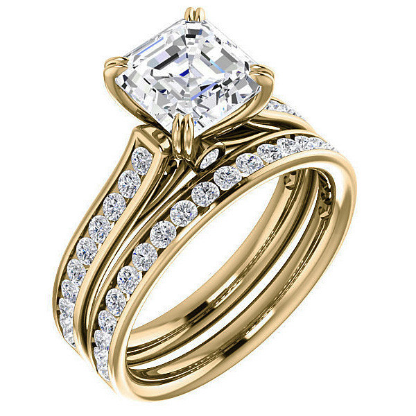 This beautiful engagement ring features a double prong head with channel design with an asscher cut colorless Moissanite center stone, 0.43ct round brilliant Moissanite side stones, and is cast in 14k gold, 18k gold, or platinum. It has an optional matching band with 0.42ct of round brilliant Moissanite side stones.