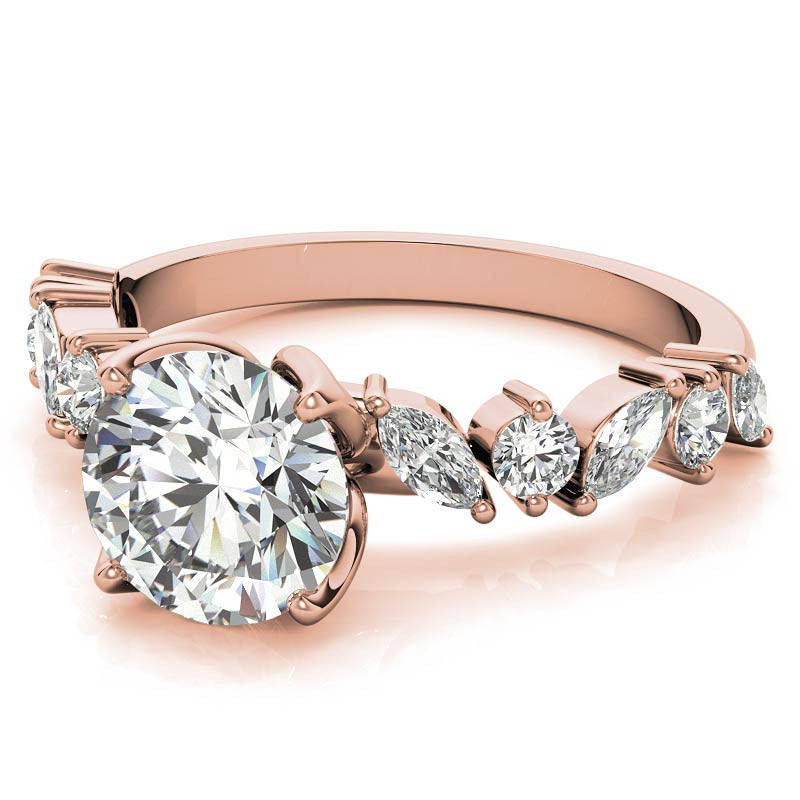 The round and marquise cut side stones are prong-set, expertly accentuating the round brilliant Moissanite center stone, which is beautifully set in a tulip setting.