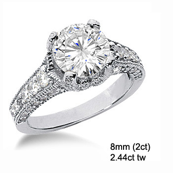 This beautiful antique design Moissanite ring features a round brilliant cut colorless Moissanite center stone and round brilliant Moissanite pave side stones, set in a 14k gold, 18k gold or platinum setting.