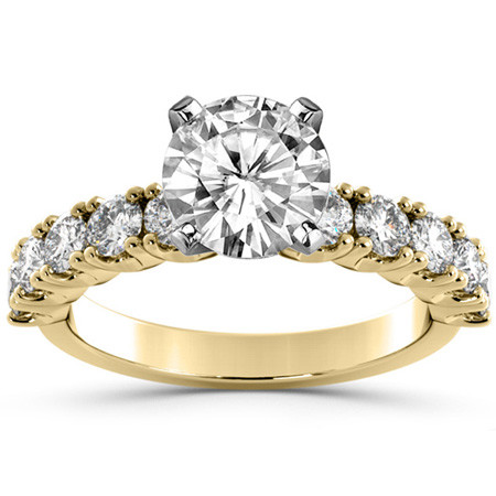 This beautiful Moissanite engagement ring setting features a 4-prong set shared-prong design with 1.0ct of round brilliant Moissanite side stones set in 14k gold, 18k gold or platinum (10x 3.0mm).