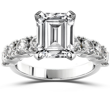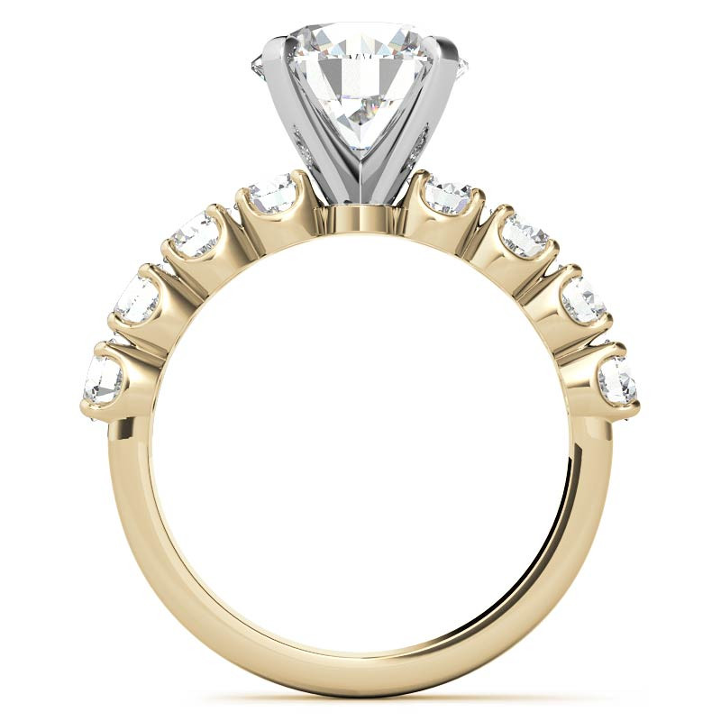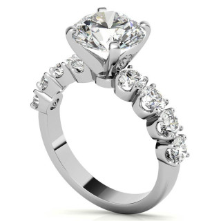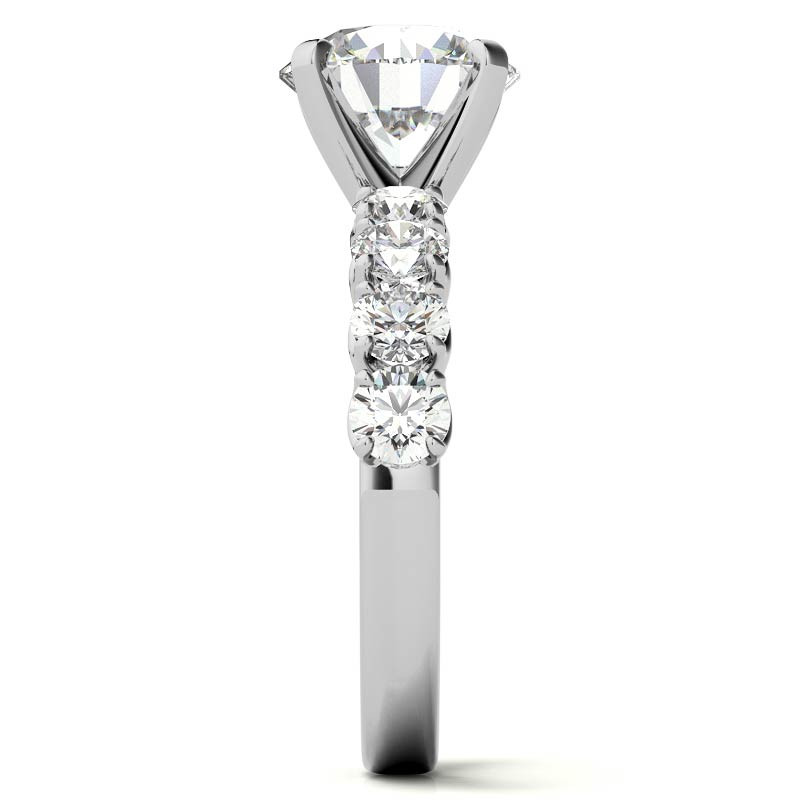 This beautiful Moissanite engagement ring setting features a 4-prong set shared-prong design with 1.2ct of round brilliant Moissanite side stones set in 14k gold, 18k gold or platinum (8x 3.5mm).