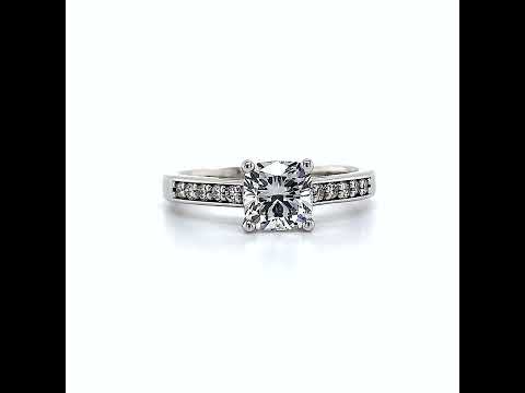 This beautiful engagement ring features a cathedral style design, 0.15 carat of round brilliant Moissanite side stones, and a cushion Moissanite center stone, set in 14k gold, 18k gold or platinum. The band measures approximately 2.4mm - 2.2mm.