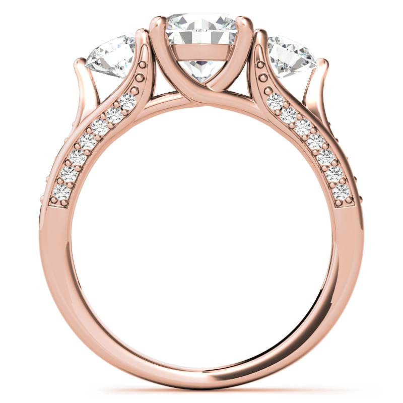 When selecting your center stone, you have the option of choosing either 1ct or 1.25ct, with the two main side stones measuring 4mm/0.25ct each. Alternatively, you may choose 1.5ct or 2.0ct for the center stone, with the two main side stones measuring 4.5mm/0.33ct each.