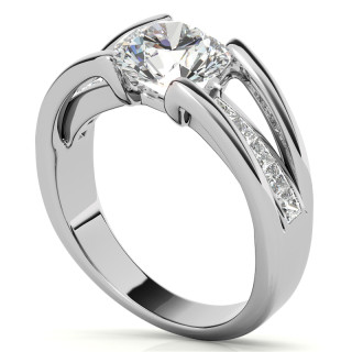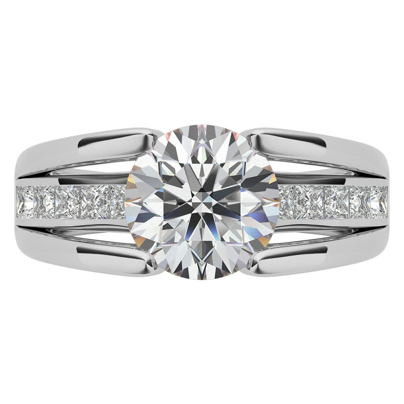 This beautiful Moissanite engagement ring features a split shank design 1/2 ct of princess cut Moissanite side stones, a 2ct/8mm round brilliant Moissanite center stone, and is set in 14k gold, 18k gold or platinum.