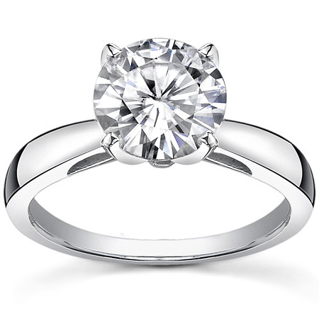 This beautiful Moissanite engagement ring features a round brilliant Moissanite center stone, a pave style basket design with 0.23ct to 0.29ct of round brilliant Moissanite side stones, set in your choice of solid 14k white gold or platinum.
