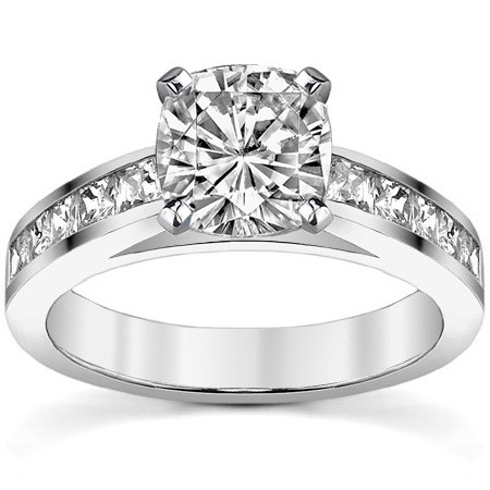 This beautiful Moissanite engagement ring setting features ten 2.5mm princess cut Moissanite stones for a total of 1.3 ct, channel set in 14k gold, 18k gold or platinum.