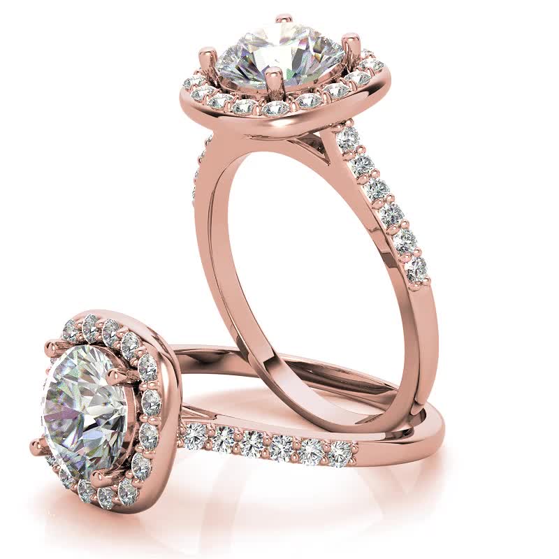 This beautiful halo style ring features a round brilliant Moissanite center stone with round brilliant Moissanite side stones (0.52ct - 0.40ct), prong set in 14k gold, 18k gold or platinum.