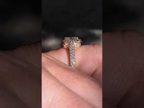 This beautiful antique milgrain halo style Moissanite ring features a radiant or emerald cut Moissanite center stone, round brilliant Moissanite side stones (0.90 - 0.75ct), and is set in 14k gold, 18k gold or platinum.