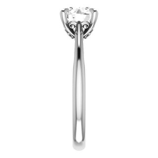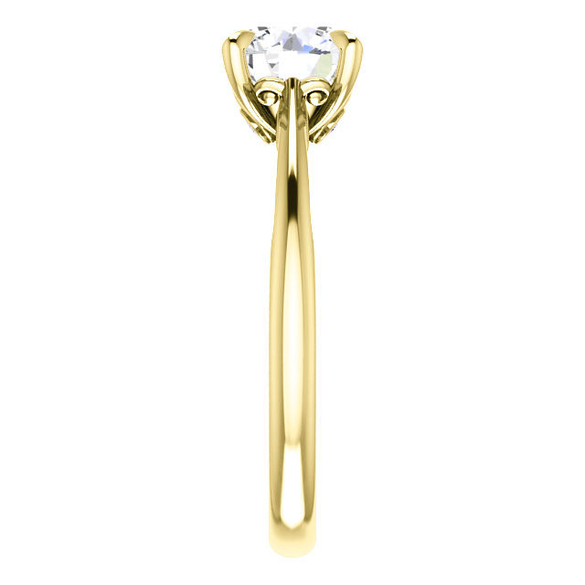 This beautiful Moissanite solitaire features a surprise stone under the center stone with scroll accents, a round Hearts and Arrows cut colorless Moissanite center stone, and is set in your choice of 14k gold, 18k gold or platinum. A matching band is available.