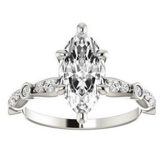 This beautiful Moissanite engagement ring features a marquise cut Moissanite center stone, cast in 14k gold/18k or platinum. The combined carat weight of the round Moissanite side stones is 0.22ct.