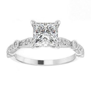 This beautiful Moissanite engagement ring features a princess cut colorless Moissanite center stone, cast in 14k gold, 18k gold or platinum. The round Moissanite side stone combined carat weight is 0.22cts. Add the optional matching band which has 0.24ct of additional diamonds and make it a wedding set.