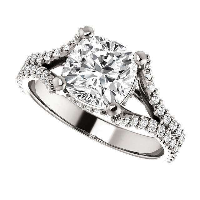 This beautiful Moissanite engagement ring features a split shank pave style design, a cushion cut colorless Moissanite center stone, 0.55ct of round brilliant Moissanite side stones cast in 14k gold, 18k gold or platinum. Add the optional matching band which has 0.26ct of round brilliant Moissanites and make it a wedding set.