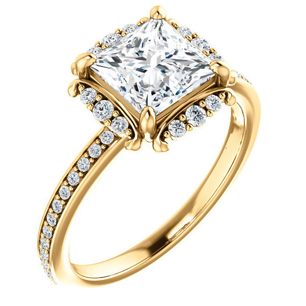 This beautiful Moissanite engagement ring features a princess cut colorless Moissanite center stone, 0.33ct of round VS, E/F quality diamond side stones cast in 14k gold, 18k gold or platinum. Add the optional matching band which has 0.16ct of additional diamonds and make it a wedding set.