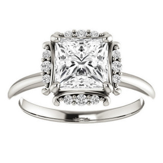 This beautiful Moissanite engagement ring features a halo style design with a princess cut colorless Moissanite center stone, 0.12ct - 0.20ct of round brilliant diamond side stones cast in 14k gold, 18k gold or platinum. Add the optional matching band and make it a wedding set.