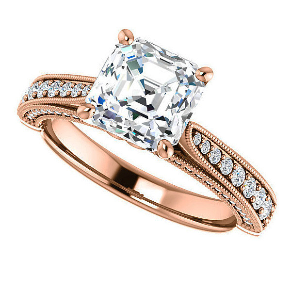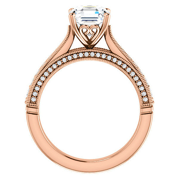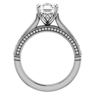 This beautiful engagement ring features a milgrain style design with a scroll basket setting, an Asscher cut colorless Moissanite center stone, 0.40ct of round brilliant Moissanite side stones, and is cast in 14k gold, 18k gold or platinum. It has an optional matching band with 0.24ct of round brilliant F1 Moissanites.