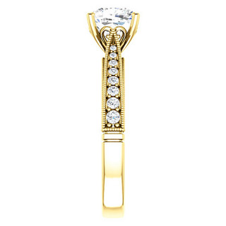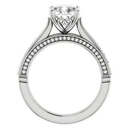 This beautiful Moissanite engagement ring features a cathedral design with milgrain accents and scroll designs on the side of a cushion cut Moissanite center stone, 0.35ct of round diamond side stones cast in 14k gold, 18k gold or platinum. Add the optional matching band which has 0.25ct of additional diamonds and make it a wedding set.