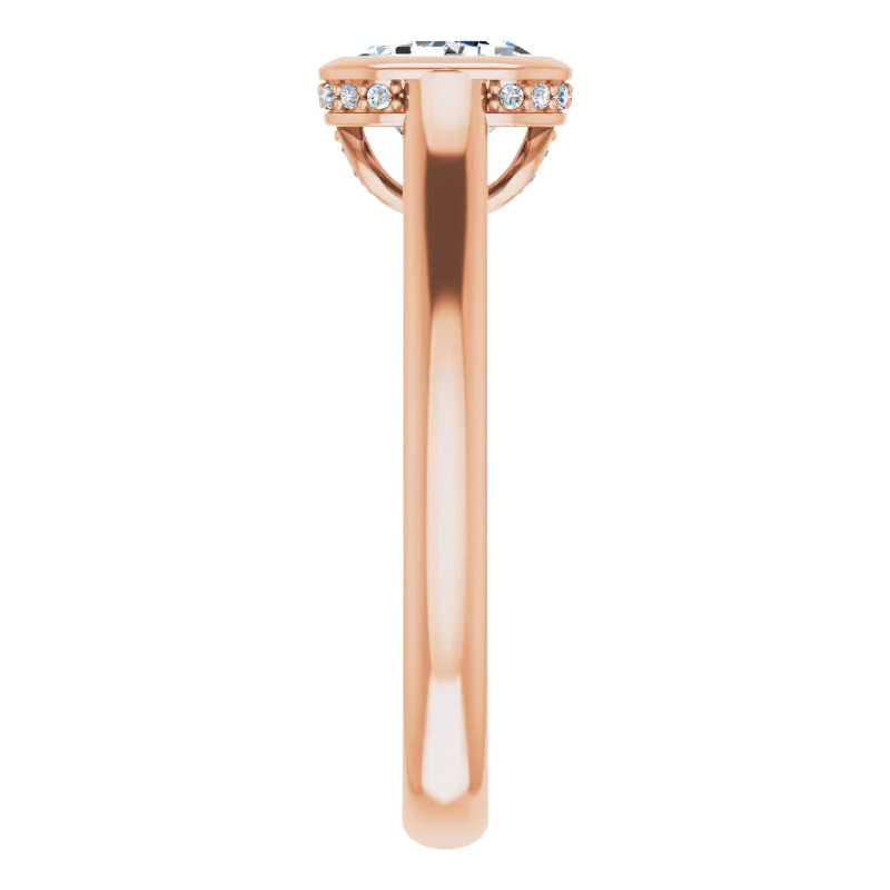 This beautiful engagement ring features a bezel style design with your choice of emerald or radiant cut colorless Moissanite center stone, round brilliant diamond side stones (0.06ct - 0.17ct), cast in 14k gold.