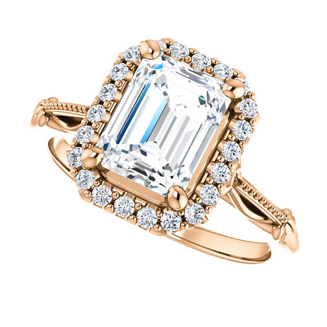 This beautiful Moissanite engagement ring features a split shank halo design that wraps around an emerald or radiant cut Moissanite center stone, 0.50ct of round brilliant Moissanite side stones cast in 14k gold, 18k gold or platinum. Add the optional matching band which has 0.20ct of Moissanites and make it a wedding set.