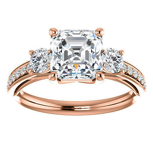 This beautiful Moissanite engagement ring features a 3-stone design with an Asscher cut colorless Moissanite center stone, two 3.5mm round brilliant cut colorless Moissanite accent stones, and is cast in 14k gold, 18k gold or platinum. The combined carat weight of the round Moissanite side stones is 0.65ct.
