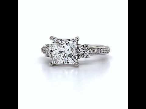 This beautiful Moissanite engagement ring features a 3-stone design with a princess cut colorless Moissanite center stone, two 3.5mm round brilliant cut colorless Moissanite accent stones, and is cast in 14k gold, 18k gold or platinum. The combined carat weight of the round Moissanite side stones is 0.65ct.