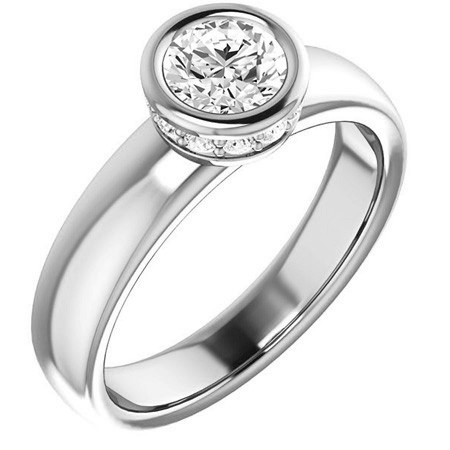 This beautiful Moissanite engagement ring features a bezel set design, a round brilliant Moissanite center stone, 0.24ct of round brilliant Moissanite side stones cast in 14k gold, 18k gold or platinum. Add the optional matching band and make it a wedding set.