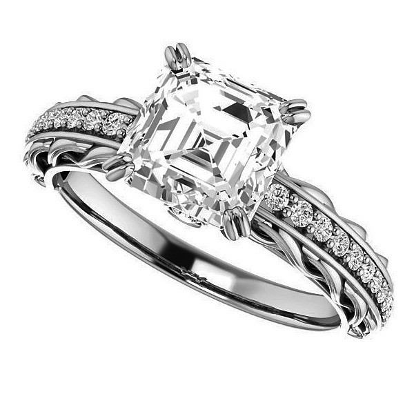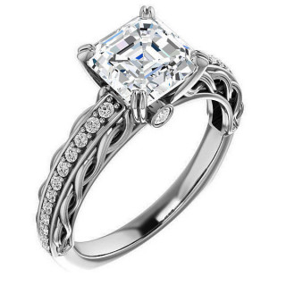 This beautiful Moissanite engagement ring features a double prong design with woven accents, an asscher colorless Moissanite center stone, 0.25ct of round brilliant Moissanite side stones cast in 14k gold, 18k gold or platinum. Add the optional matching band which has 0.15ct of additional diamonds and make it a wedding set.