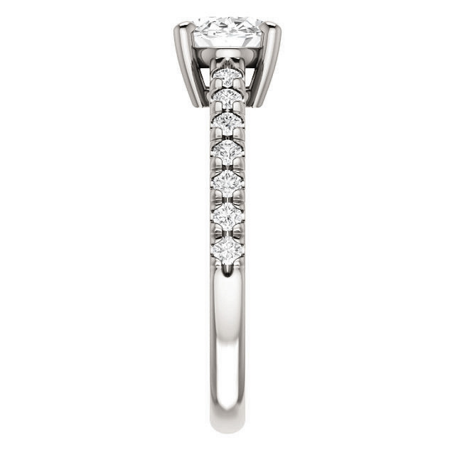 This beautiful Moissanite engagement ring features u-shaped prongs, an oval cut colorless Moissanite center stone, and 0.28ct of round brilliant Moissanite side stones.