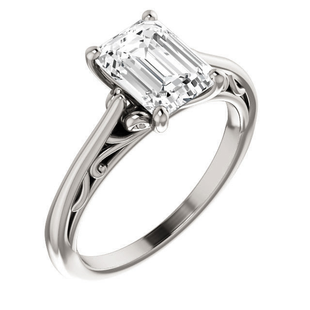 This beautiful Moissanite solitaire ring features a cathedral setting with scroll design, a radiant or emerald cut colorless Moissanite center stone, and is available in your choice of 14k or 18k gold or platinum. Add the optional matching band to make it a complete bridal set.