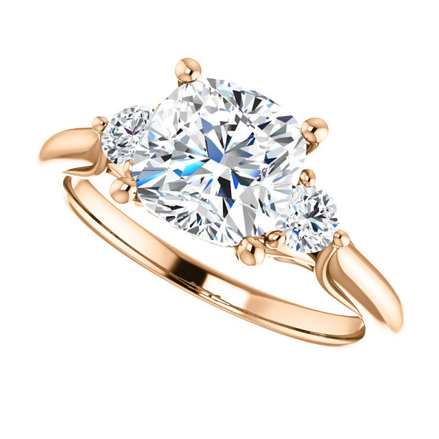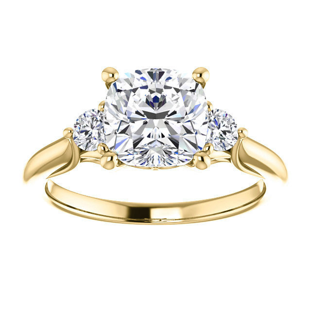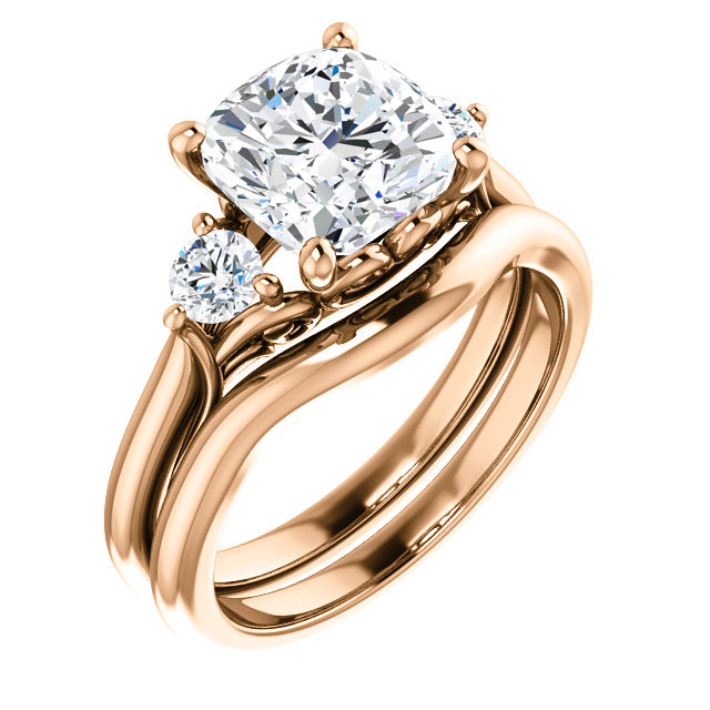 This 3-stone ring features scroll work under the cushion cut Moissanite center stone with two round brilliant cut Moissanite side stones, set in your choice of 14k gold, 18k gold or platinum. Add the optional matching band to make it a wedding set.