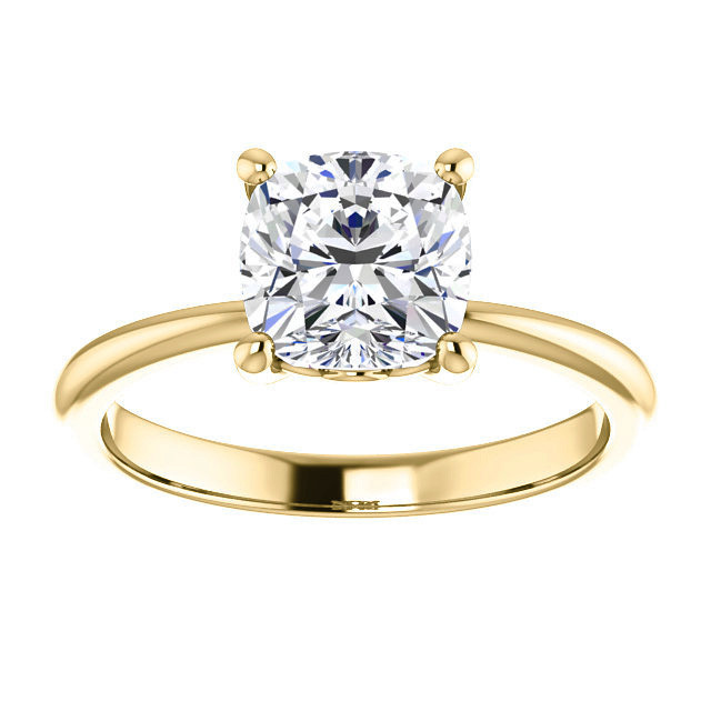 This beautiful Moissanite solitaire features a tapered band and a delicate basket setting holding the cushion cut colorless Moissanite center stone, and is set in your choice of 14k gold, 18k gold or platinum. A matching band is available.