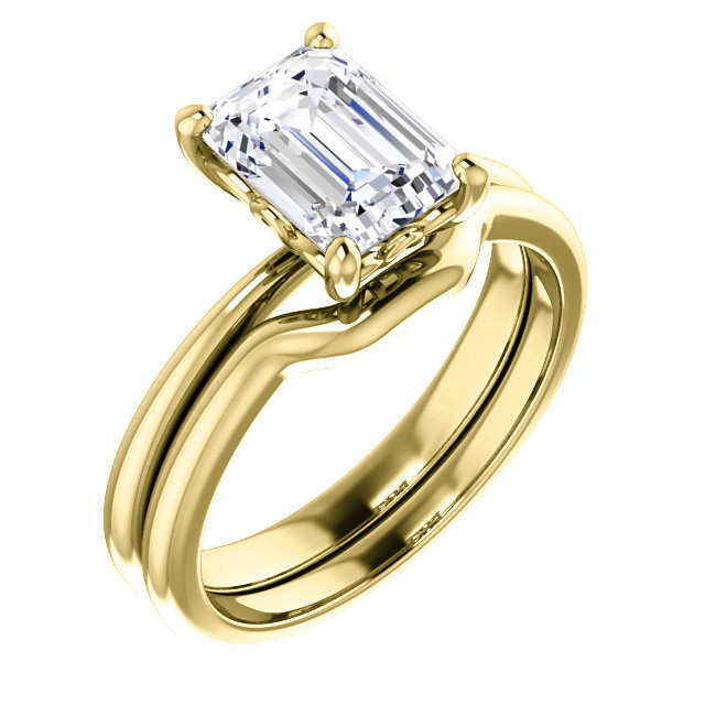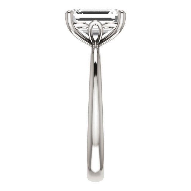 This beautiful Moissanite solitaire features a tapered band and a delicate basket setting holding the emerald or radiant cut colorless Moissanite center stone, and is set in your choice of 14k gold, 18k gold or platinum. A matching band is available.