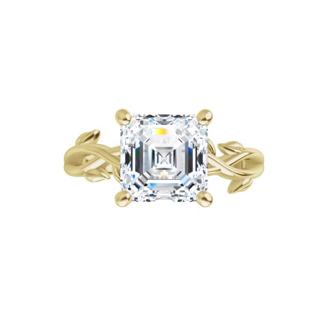 This solitaire ring features a floral design set with an Asscher cut colorless Moissanite center stone, and is set in your choice of 14k gold, 18k gold or platinum. A matching band is available.