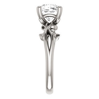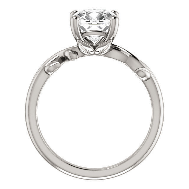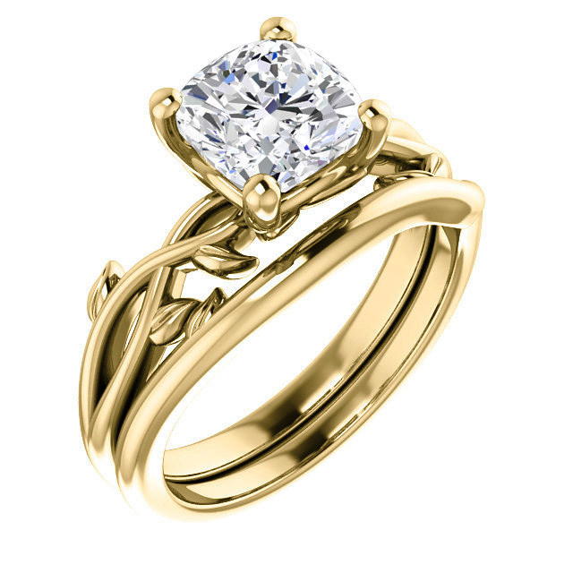 This solitaire ring features a floral design set with a cushion cut Moissanite center stone and is set in your choice of 14k gold, 18k gold or platinum. A matching band is available.