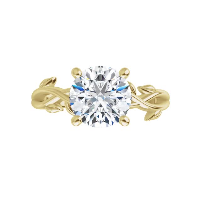 This solitaire ring features a floral design with leaf accents, a round brilliant cut colorless Moissanite center stone, and is set in your choice of 14k gold, 18k gold or platinum. A matching band is available.