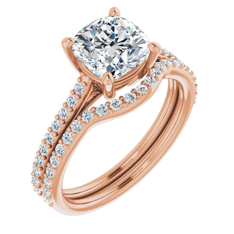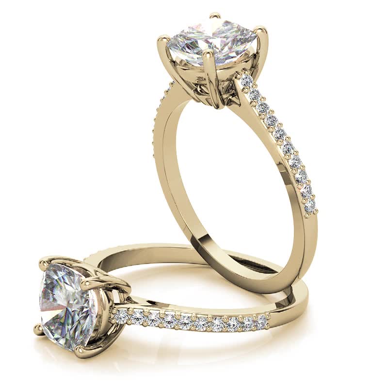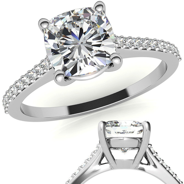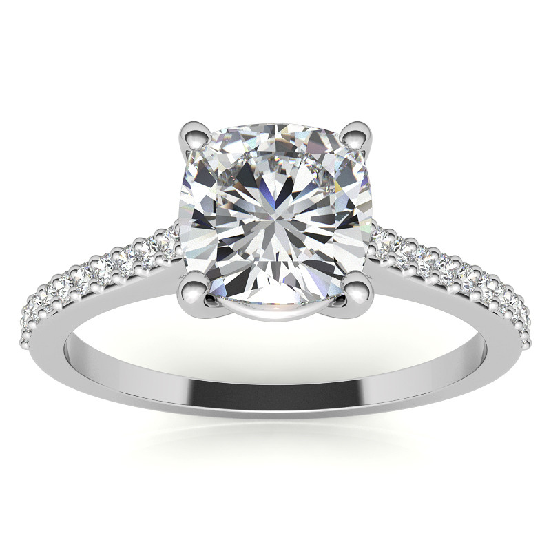 This beautiful Moissanite engagement ring features an accented cathedral design with a cushion cut Moissanite center stone, set in 14k gold, 18k gold or platinum with 0.22cts of round brilliant cut Moissanite side stones. A matching band is available.