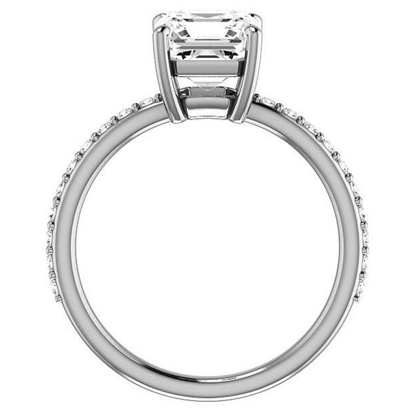 This particular ring boasts a classic look with a thin 1.5mm band and a basket setting that showcases a beautiful asscher cut Moissanite center stone. Additionally, 0.22ct of round brilliant Moissanite side stones add an extra layer of brilliance to the ring's overall look.