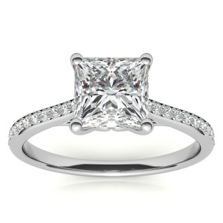 This beautiful Moissanite engagement ring features a cathedral design with scroll accents, a princess cut colorless Moissanite center stone, and 0.17cts of diamond side stones in your choice of 14k gold, 18k gold or platinum. Choose a matching band to complete this stunning wedding set.