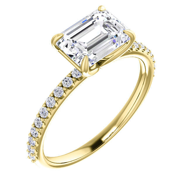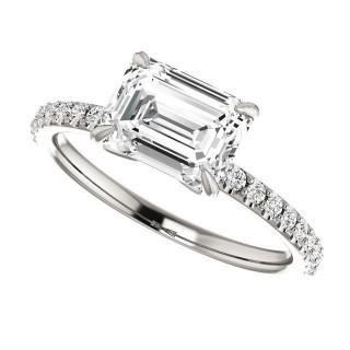 This beautiful Moissanite engagement ring features an emerald or radiant cut colorless Moissanite center stone surrounded by delicate claw prongs, 0.20ct of round brilliant colorless Moissanite side stones, and is available in your choice of 14k gold, 18k gold or platinum.