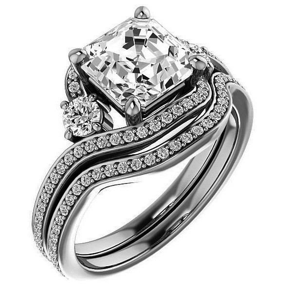 At the heart of this enchanting piece lies an asscher cut Moissanite center stone, radiating brilliance and capturing attention from every angle. Enhancing the three-stone aesthetic, two exquisite 3mm/0.30ct side stones gracefully flank the center stone, adding depth and dimension to the ring's design.