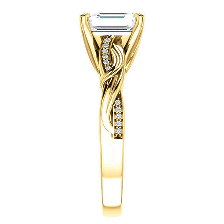 This beautiful Moissanite engagement ring features a delicate infinity accented design, your choice of an emerald or radiant cut colorless Moissanite center stone, and 0.05cts of diamond side stones in your choice of 14k gold, 18k gold or platinum. Add the optional matching band to make it a complete bridal set.