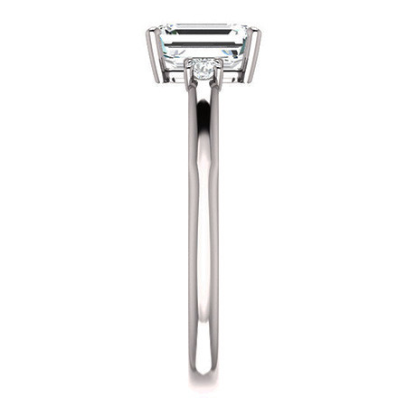 This beautiful three-stone engagement ring features your choice of an emerald or radiant cut colorless Moissanite center stone and two round brilliant cut colorless Moissanite side stones, set in your choice of 14k gold, 18k gold or platinum. Add the optional matching band to complete this wedding set.