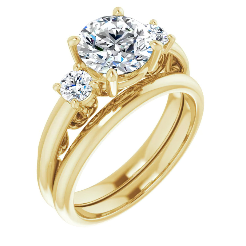 This beautiful three-stone engagement ring features a round brilliant cut Moissanite center stone and two round brilliant cut Moissanite side stones, set in your choice of 14k gold, 18k gold or platinum. Add the optional band to make the set complete.