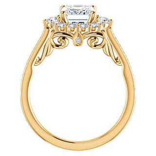 This stunning engagement ring features a halo design with scroll accents, an emerald or radiant cut Moissanite center stone, two smaller accenting Moissanite stones, and is set in your choice of 14k gold, 18k gold or platinum. The side stone carat weight ranges from 0.45ct - 0.85ct depending on the center stone size selected. Choose the optional matching band to make it a complete wedding set.