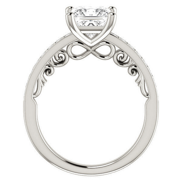 This beautiful engagement ring features an infinity design, set with a princess cut colorless Moissanite center stone in your choice of 14k gold, 18k gold or platinum. The combined carat weight of the round Moissanite side stones is 0.25ct. Add the optional matching to make it a complete set.