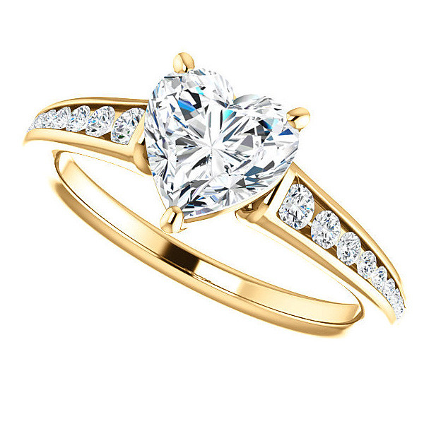 This beautiful engagement ring features a heart shaped Moissanite center stone and 0.24cts of channel-set VS, E/F quality diamond side stones, set in your choice of 14k gold, 18k gold or platinum. Add the optional matching band to make it a complete set.